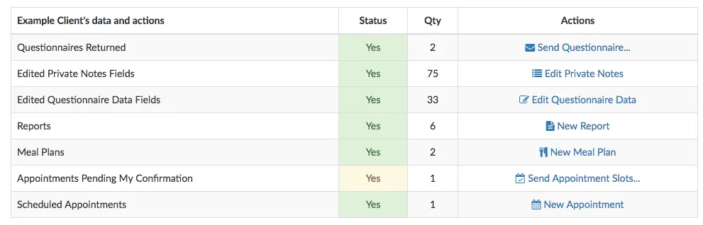 Apart from the different numbers in the status table, you can also quickly see at a glance how many of the actions are completed (in green) or may need attention (in yellow). Having many pending actions with a client (yellow) gives you an idea that this must be a new client who you are still having consultations with, need to schedule appointments, and write reports, etc. A client with fewer pending actions is likely someone you've already worked with.